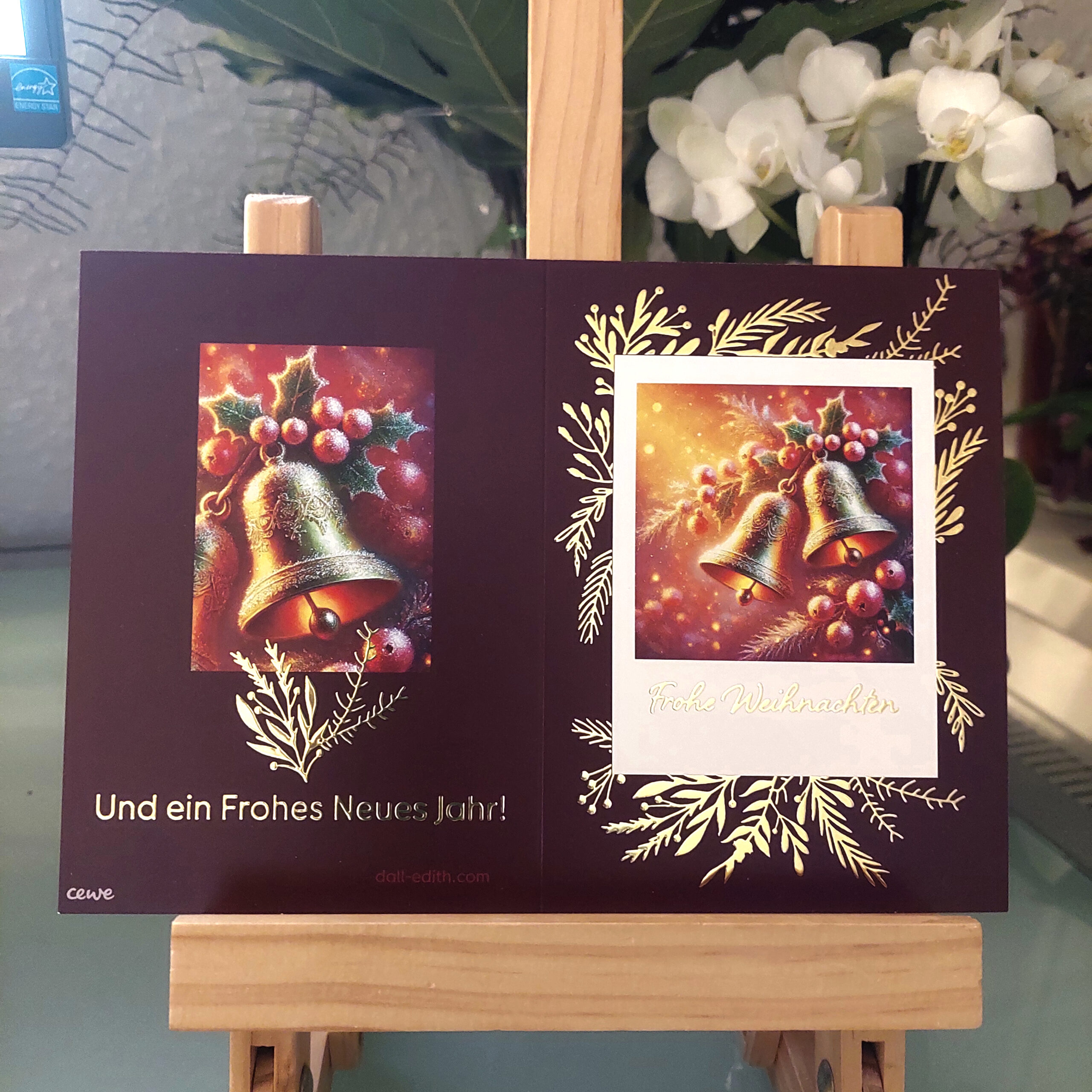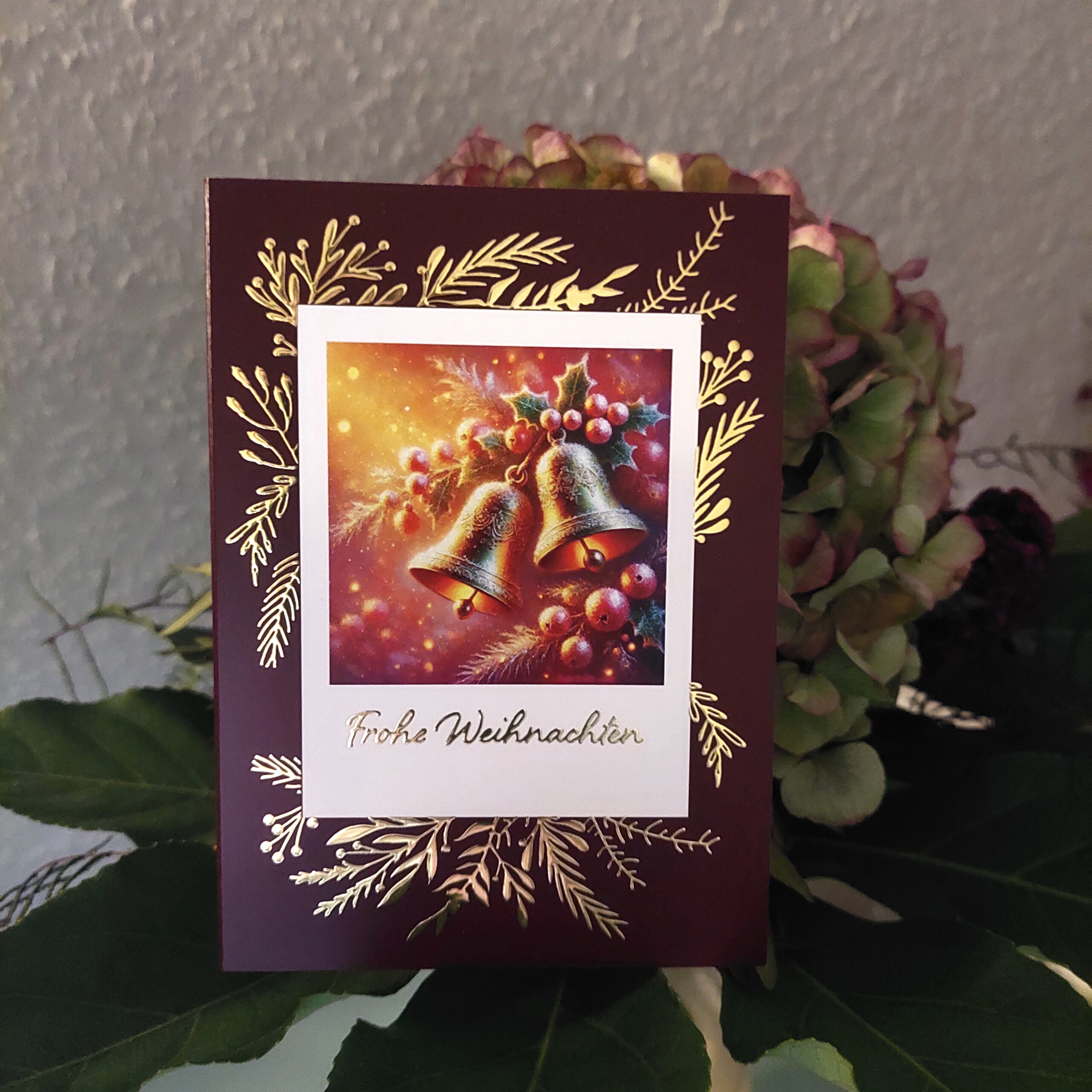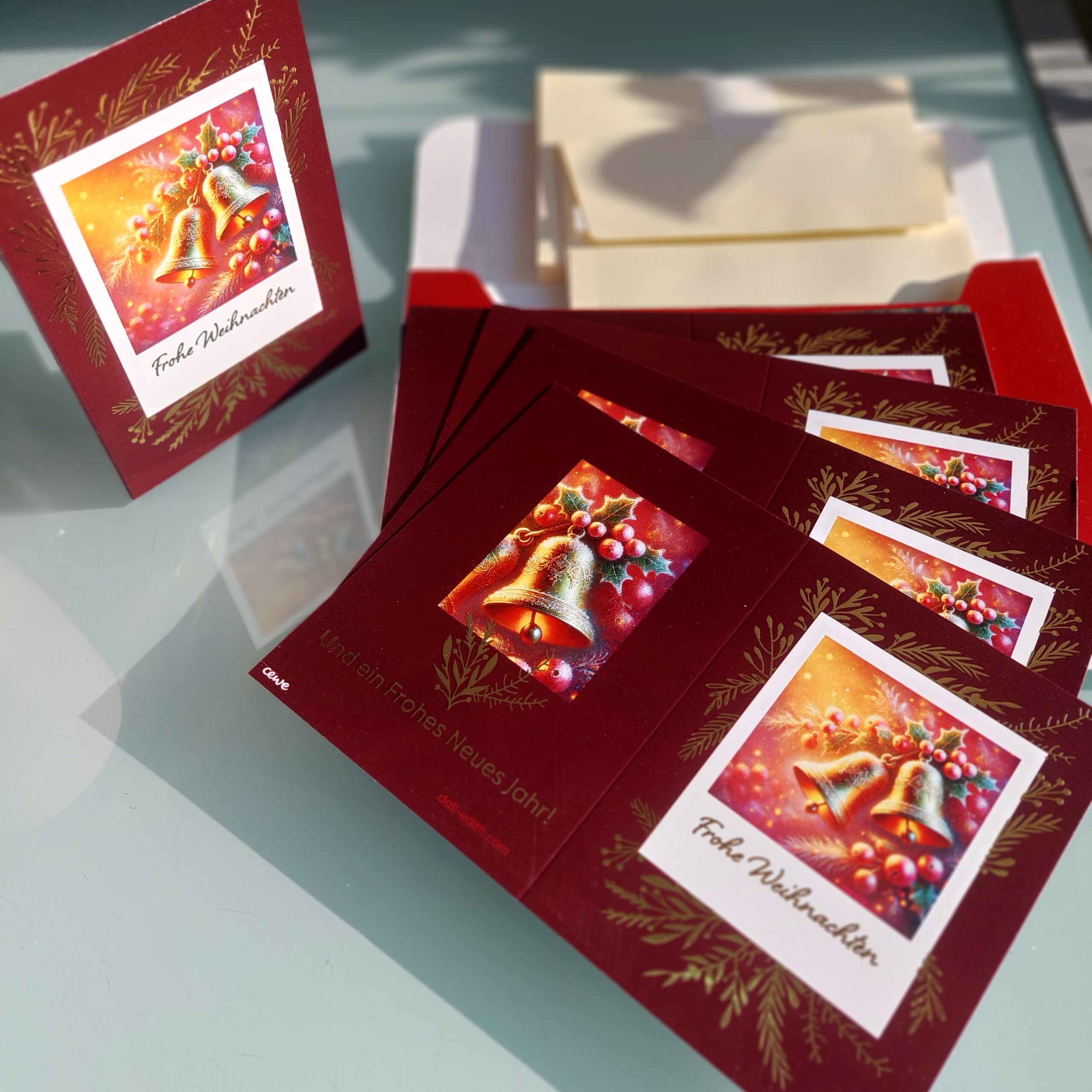 5 elegante Weihnachtskarten mit goldenen Akzenten und festlichem Glockenmotiv in rot. Ideal für Geschäftspartner, Kundengeschenke oder persönliche Weihnachtsgrüße. Premium-Druck auf edlem Karton, liebevoll gestaltet.