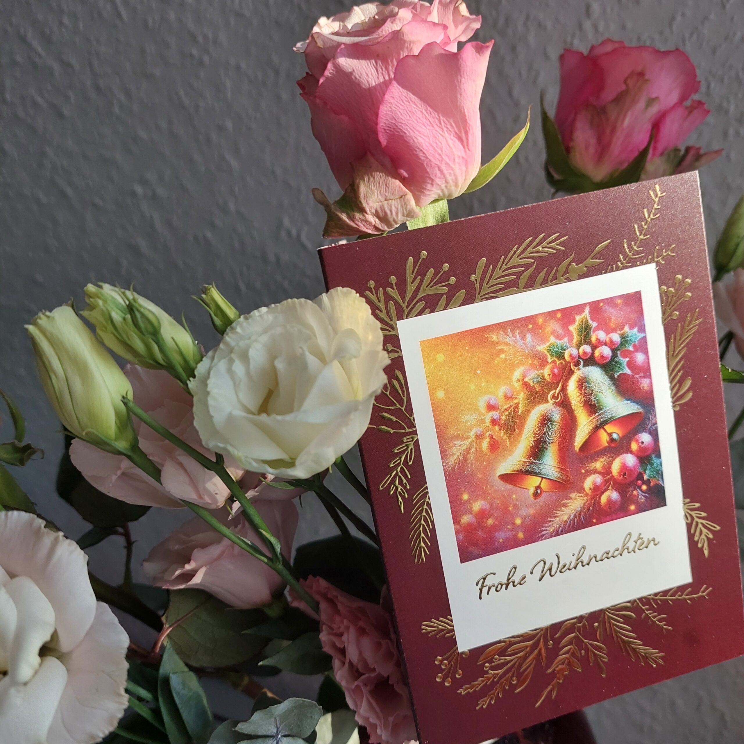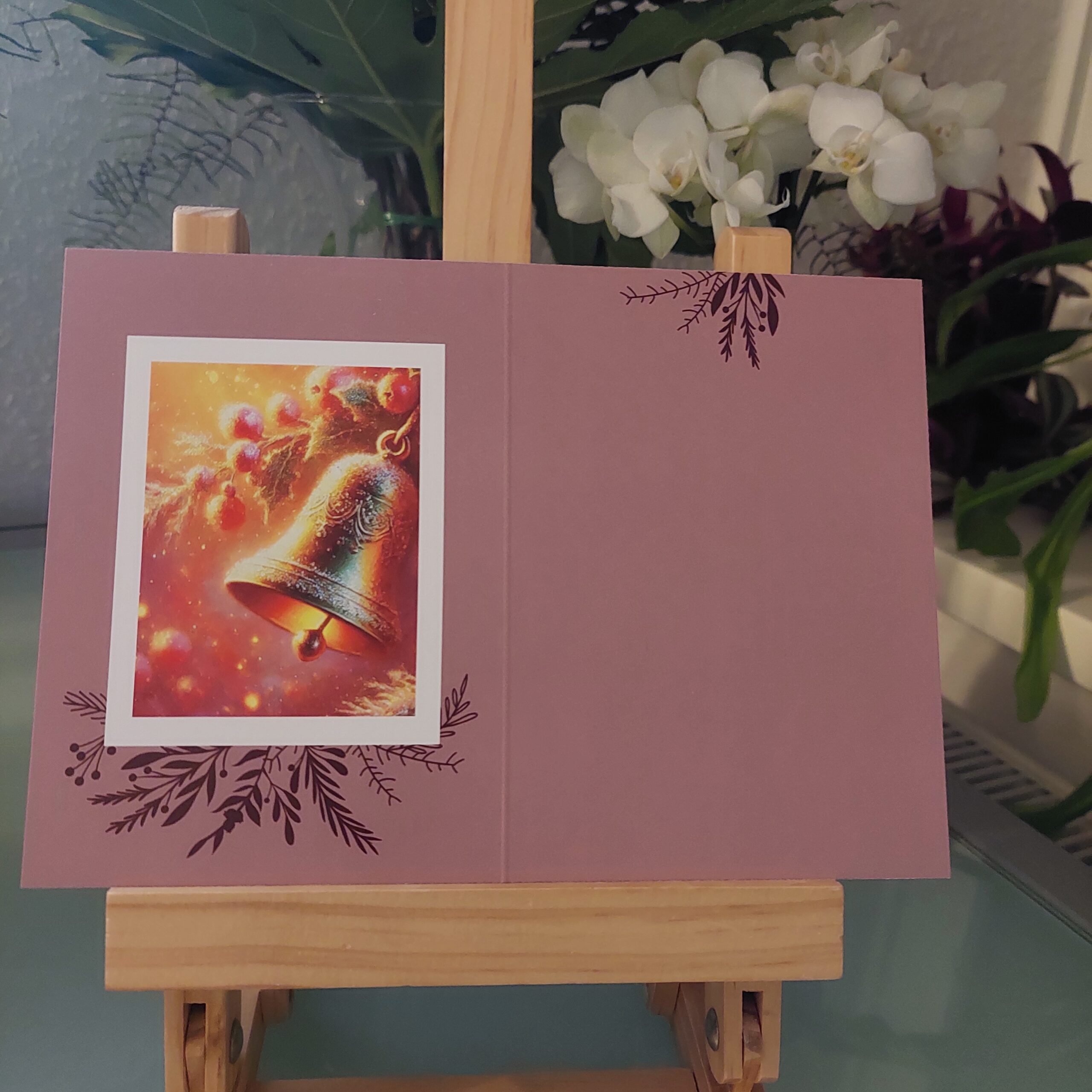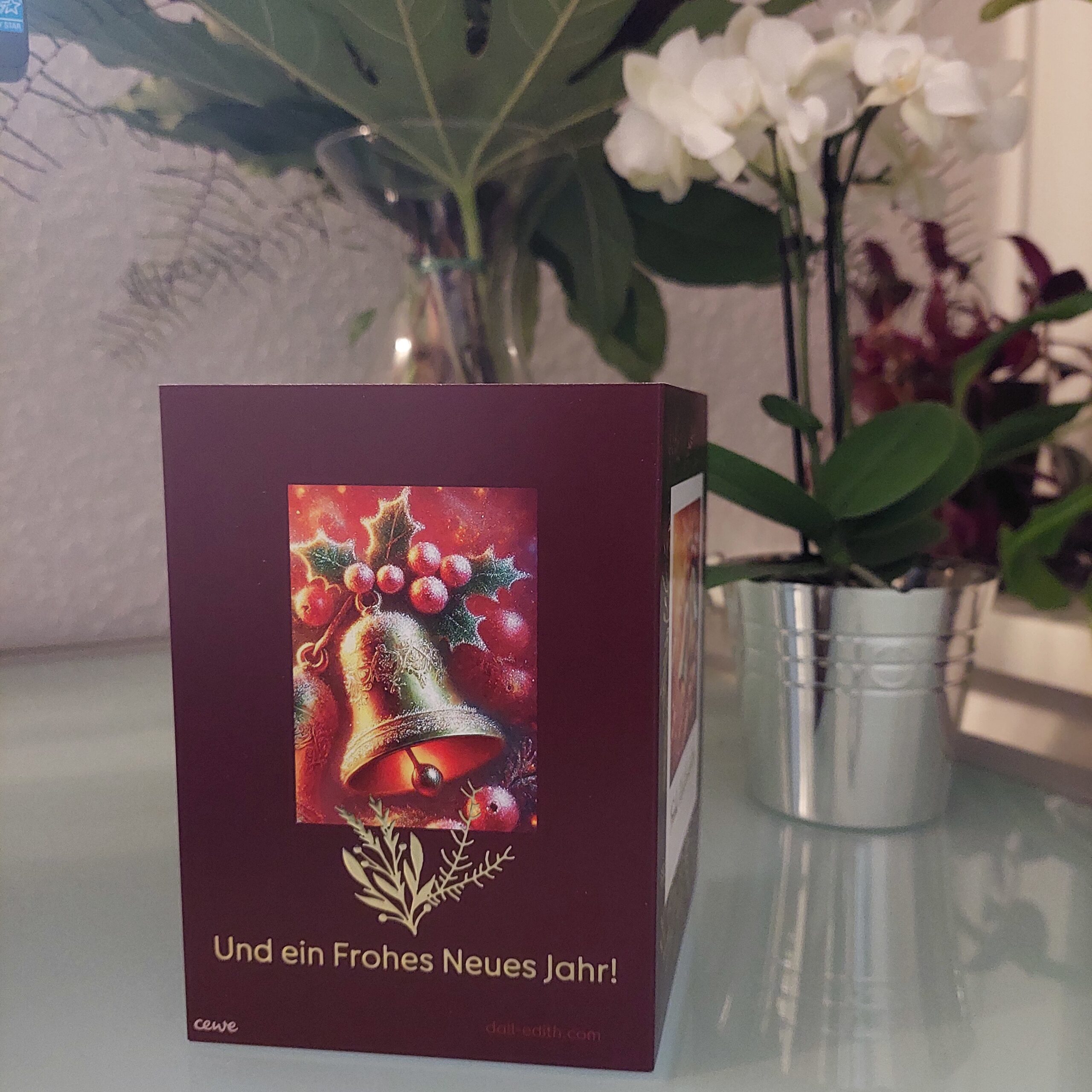 5 elegante Weihnachtskarten mit goldenen Akzenten und festlichem Glockenmotiv in rot. Ideal für Geschäftspartner, Kundengeschenke oder persönliche Weihnachtsgrüße. Premium-Druck auf edlem Karton, liebevoll gestaltet.
