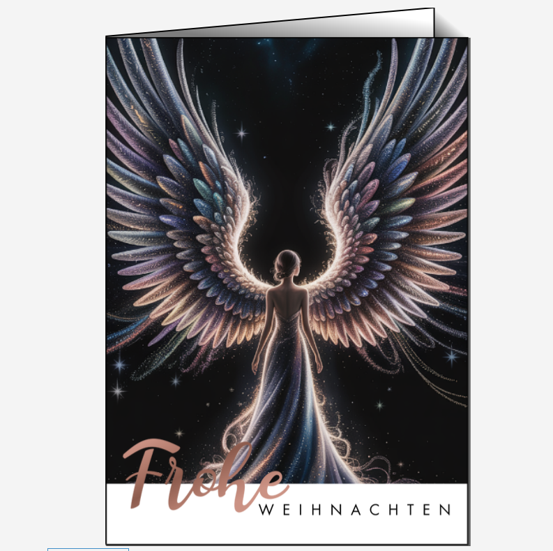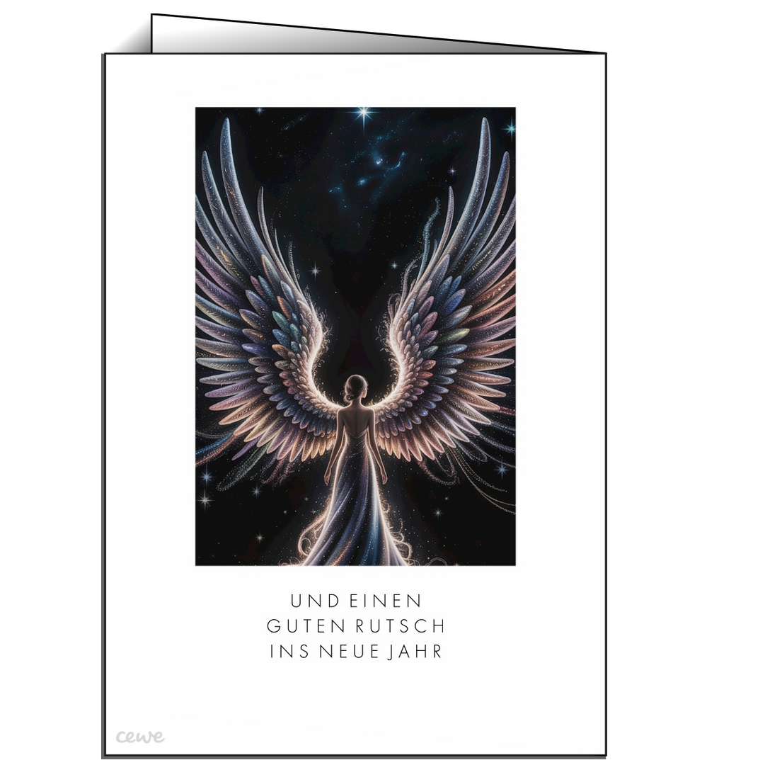 Diese elegante Weihnachts- und Neujahrskarte zeigt eine schimmernde Engelsfigur mit weit ausgebreiteten, pastellfarbenen Flügeln vor einem Sternenhimmel. Das Motiv wirkt modern, festlich und inspirierend. Sie ist ideal für besondere Weihnachtsgrüße, spirituelle Botschaften oder hochwertige Kundengeschenke.